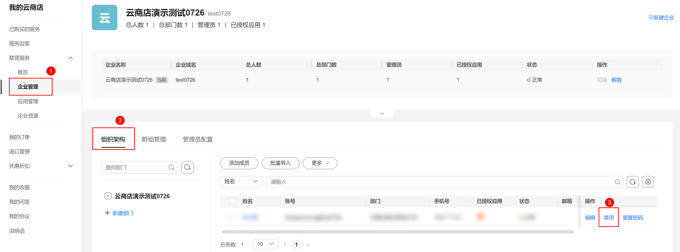 管理员登录“买家中心>联营服务>企业管理>组织架构”,在成员列表中单击“禁用”操作,弹出“是否禁用成员”二次确认弹框。