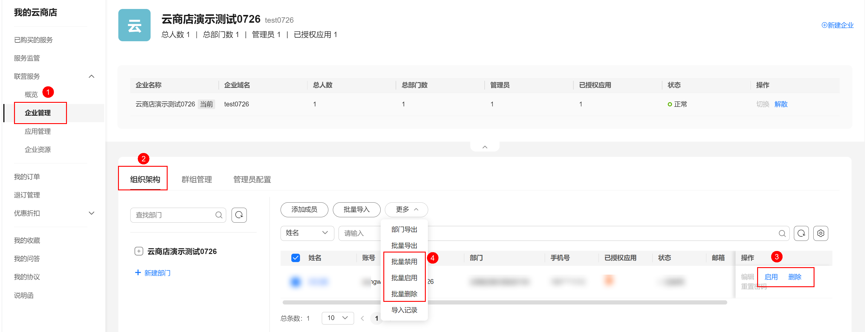 - 单击“启用”操作可以重新启用成员,恢复成员使用状态。也可勾选多个成员,单击“批量启用”“批量删除”操作启用多个被禁用成员。
