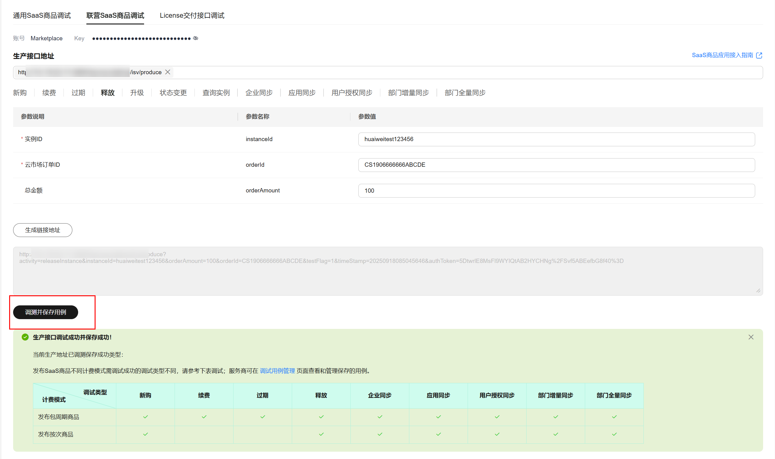 - 单击“调测并保存用例”,系统会调用生产链接进行接口测试,如测试成功,则系统提示“调测用例成功并保存成功”;如测试失败,则会在页面下方展示对应错误信息,商家可根据对应信息进行接口修改。