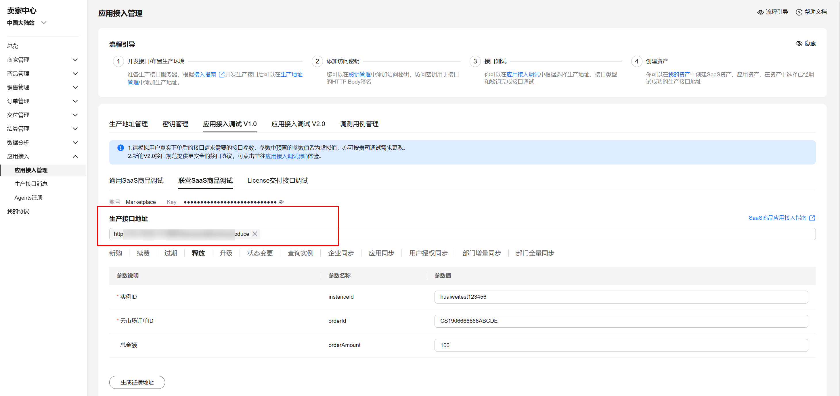 为了保证使用saas接入方式的正确性,云商店为商家在卖家中心搭建了应用接入调试界面。商家可以在此页面调试saas接口在各个调用场景的正确性。