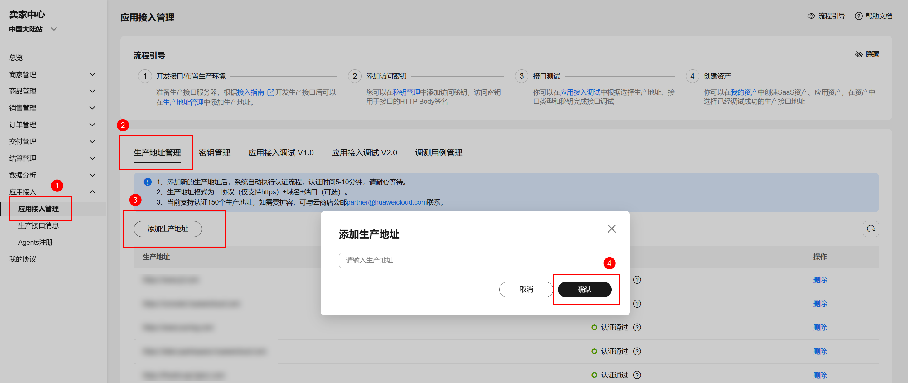 - 请将认证通过的生产接口地址 path填入输入框中,如:https://console.huaweicloud.com/test/test1;