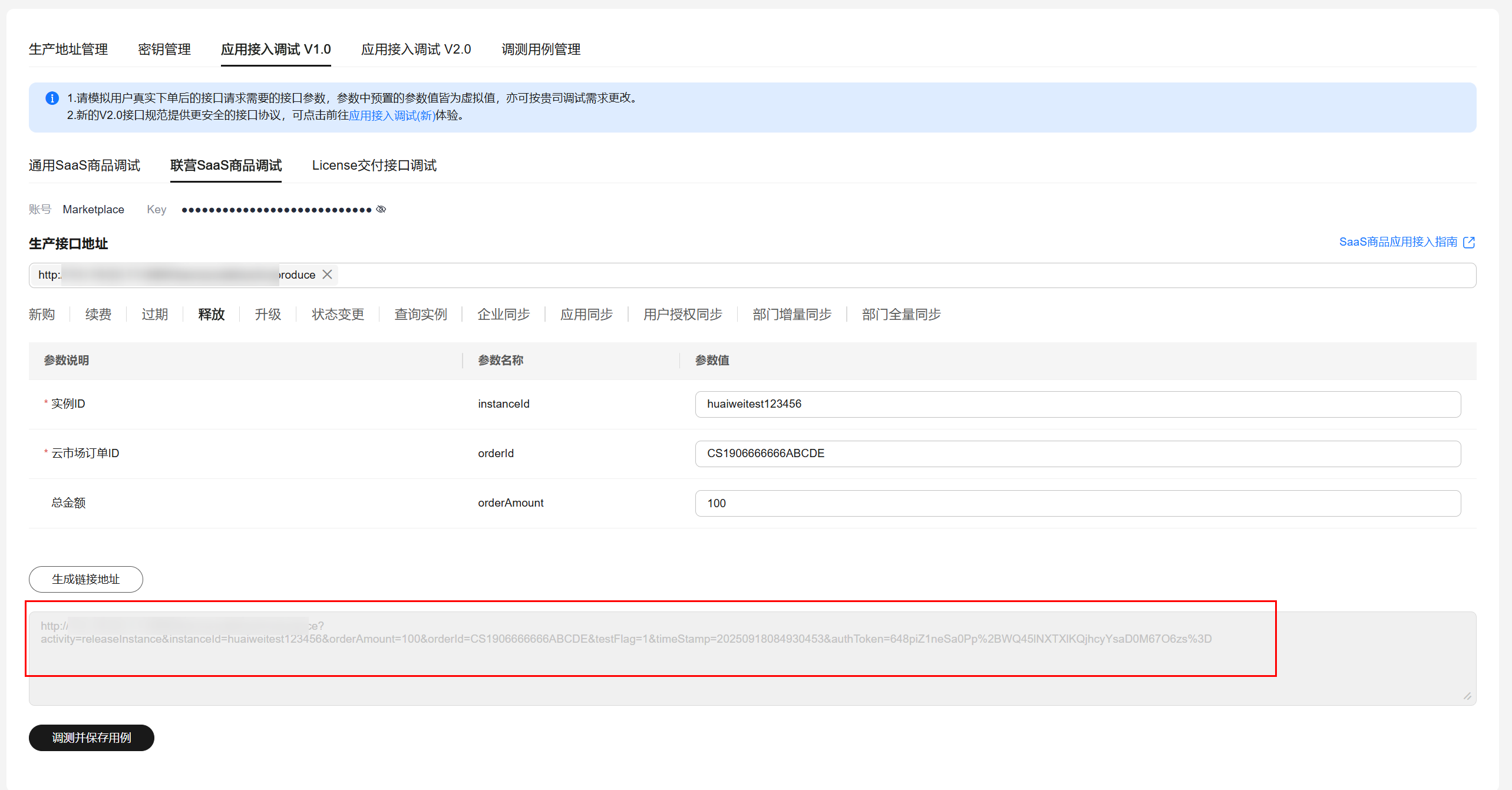 为了保证使用saas接入方式的正确性,云商店为商家在卖家中心搭建了应用接入调试界面。商家可以在此页面调试saas接口在各个调用场景的正确性。