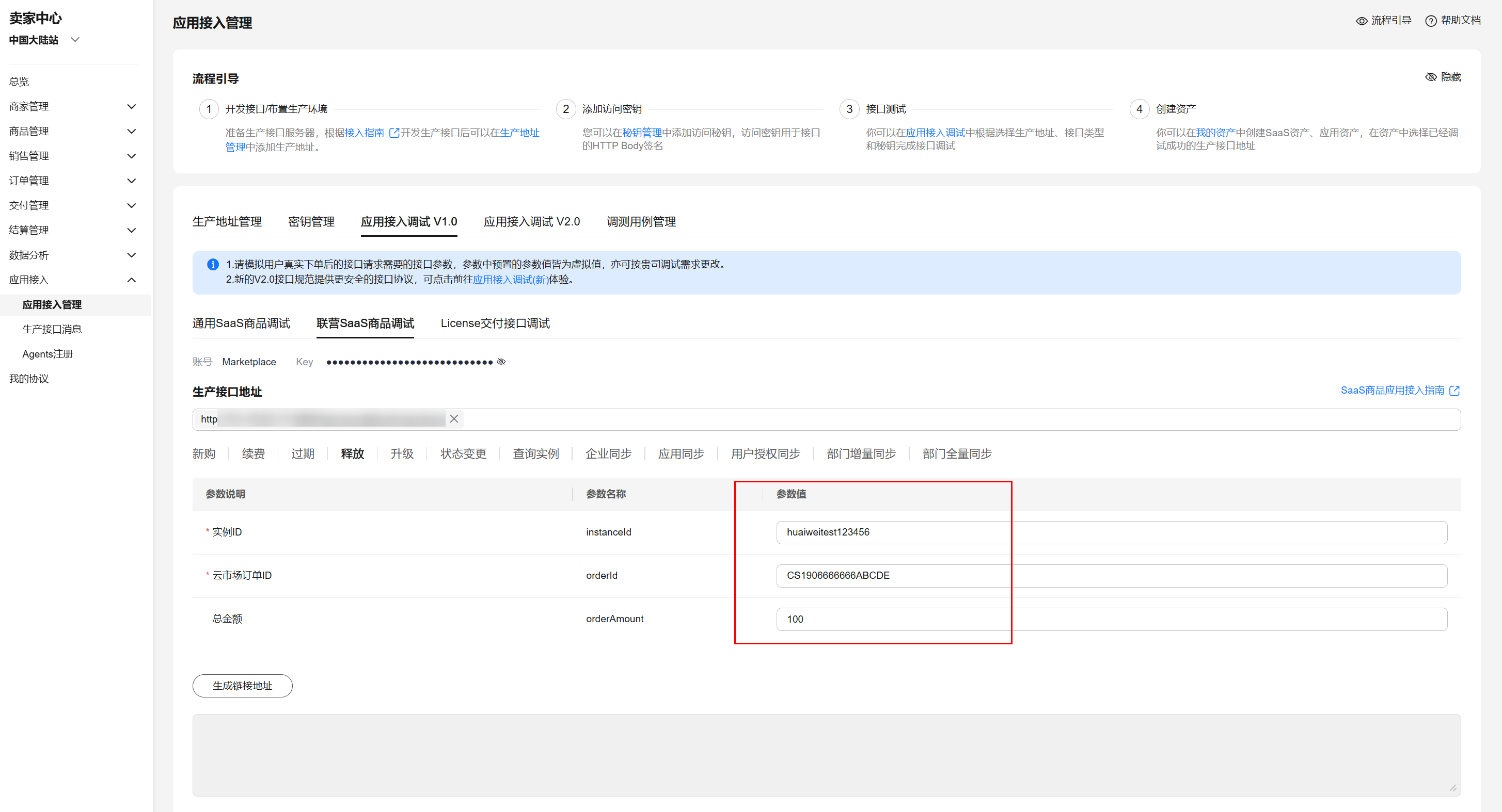 - 参照请求消息中的参数说明在商家系统中预置参数值进行调测。