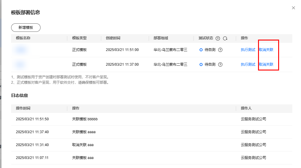 - 在“页面,单击需要删除的资产操作列“取消关联”或“新增模板”按钮,确认删除即可。