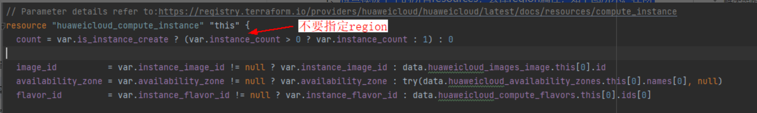 - 检查模板中的所有resources,去掉region属性,如下图所示。在创建华为云资源的时候,如果不指定region,将会使用provider级别的region,更新信息可参考;