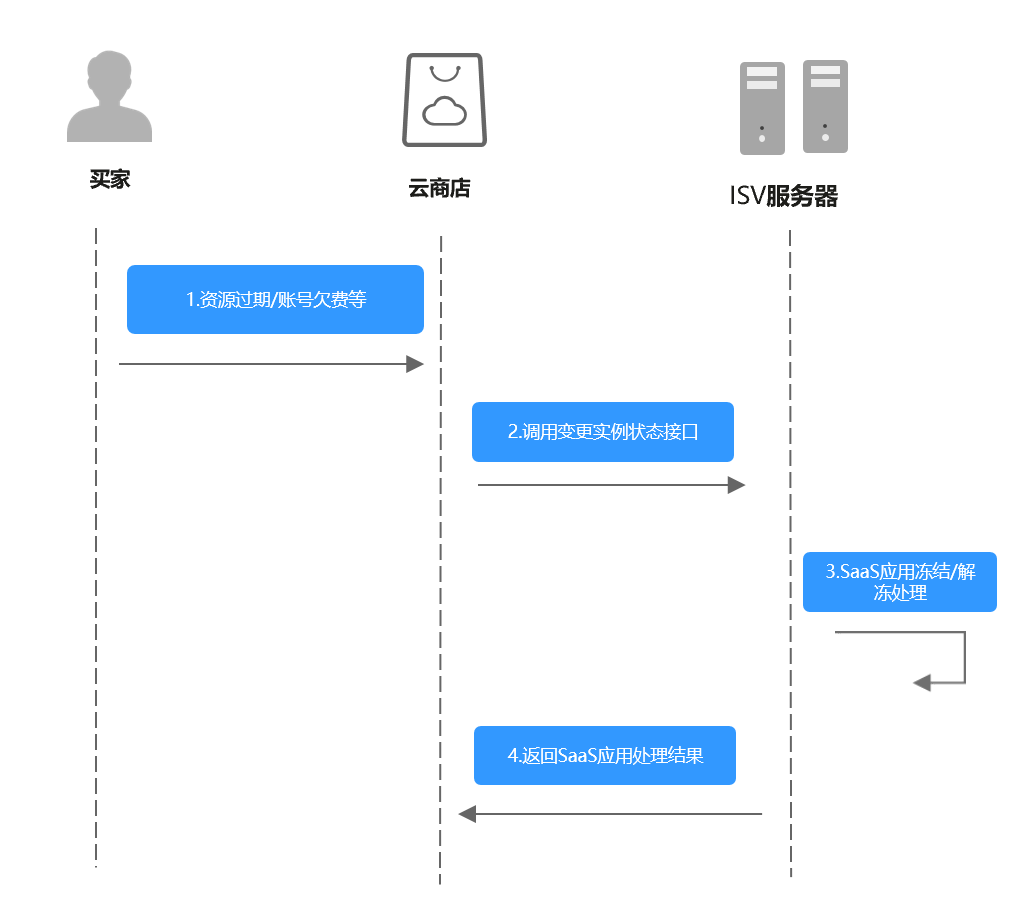 用户购买按周期计费商品后,对应的资源实例到期、违规等场景,云商店调用该接口,商家将指定的实例冻结。
