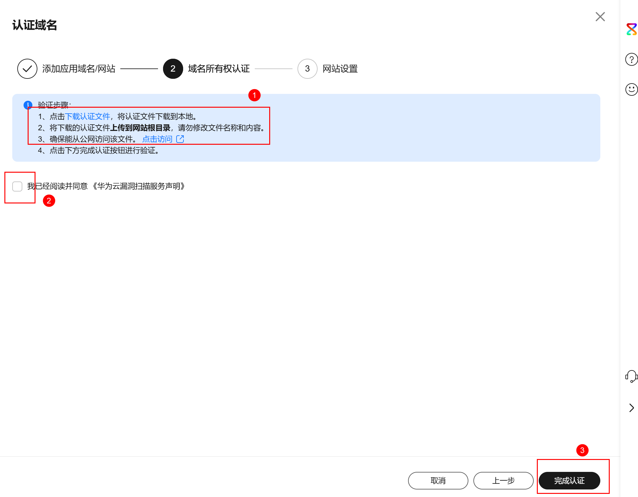 - 按验证步骤完成域名所有权认证,勾选“我已阅读并同意《华为云漏洞扫描服务声明》,单击“完成认证”。