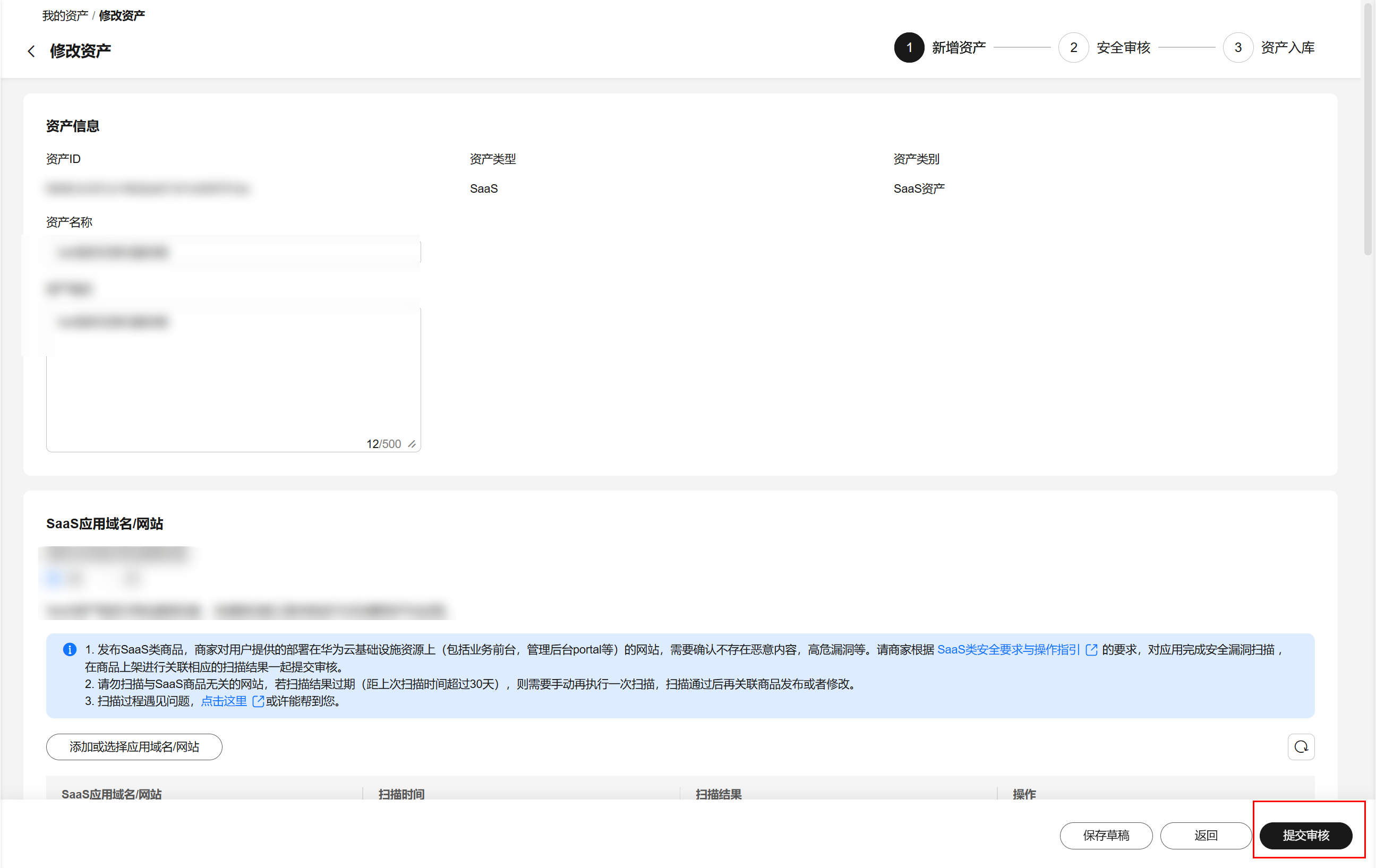- 如安全问题已完成整改,单击“修改”,再次提交saas资产审核。