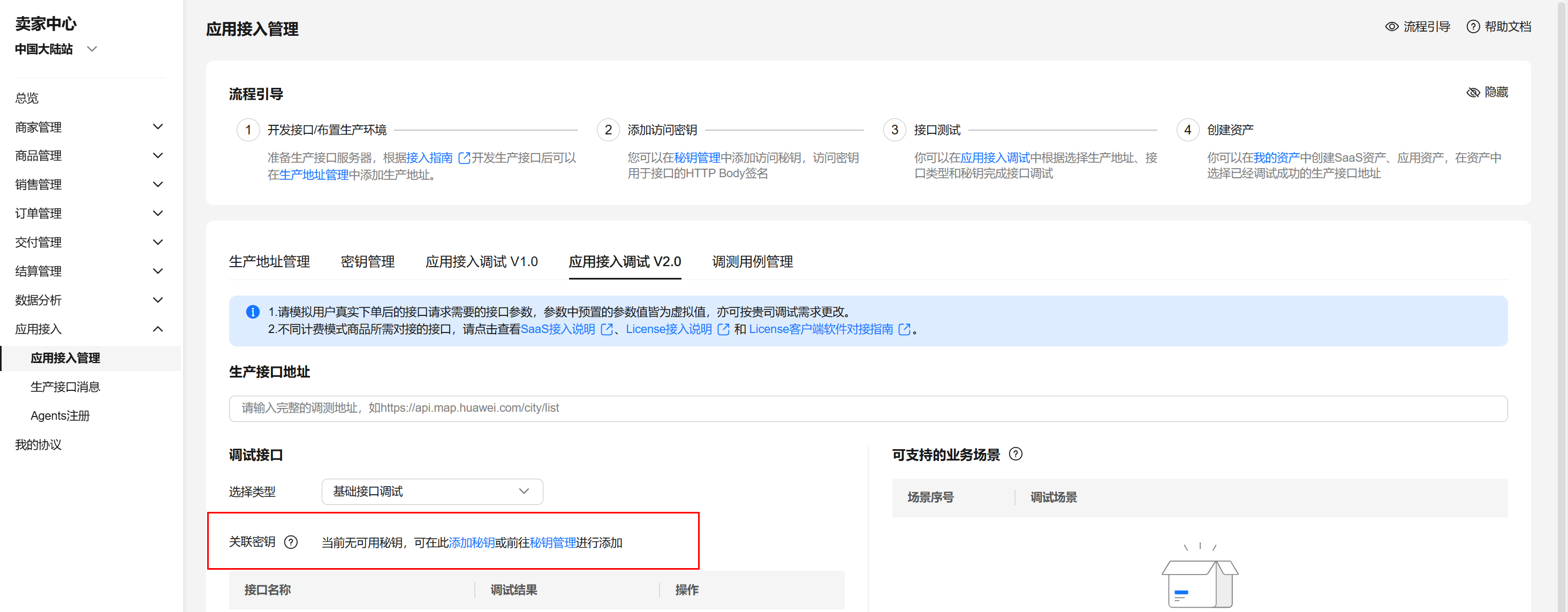 - 请先按照下图操作绑定密钥,每一类接口类型绑定的密钥不可用重复(基础接口、联营saas同步接口),如无密钥,请参考。