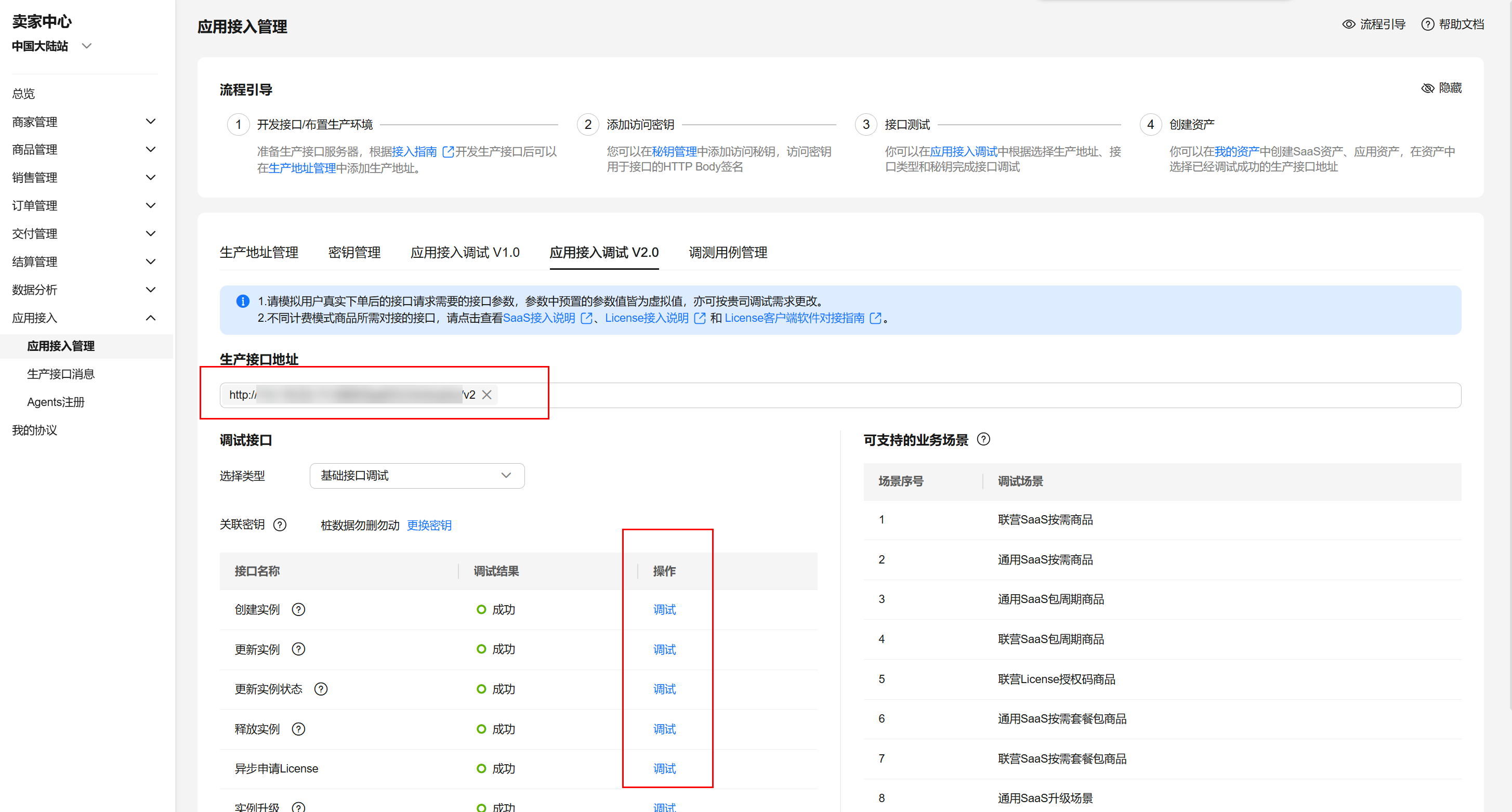为了保证使用saas接入方式的正确性,云商店为商家在卖家中心搭建了应用接入调试界面。商家可以在此页面调试saas接口在各个调用场景的正确性。