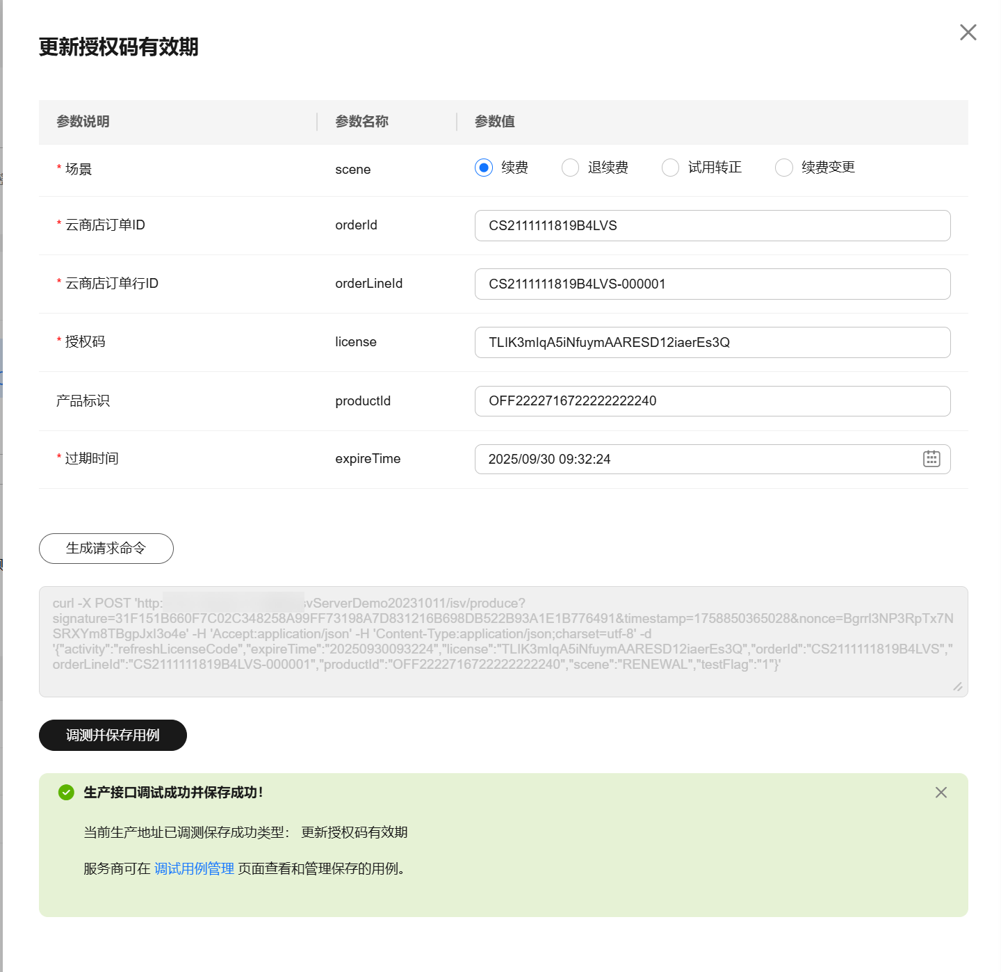 - 在“更新授权码有效期”页签,填写预置的各个参数值,单击“生成请求命令”生成请求消息示例。