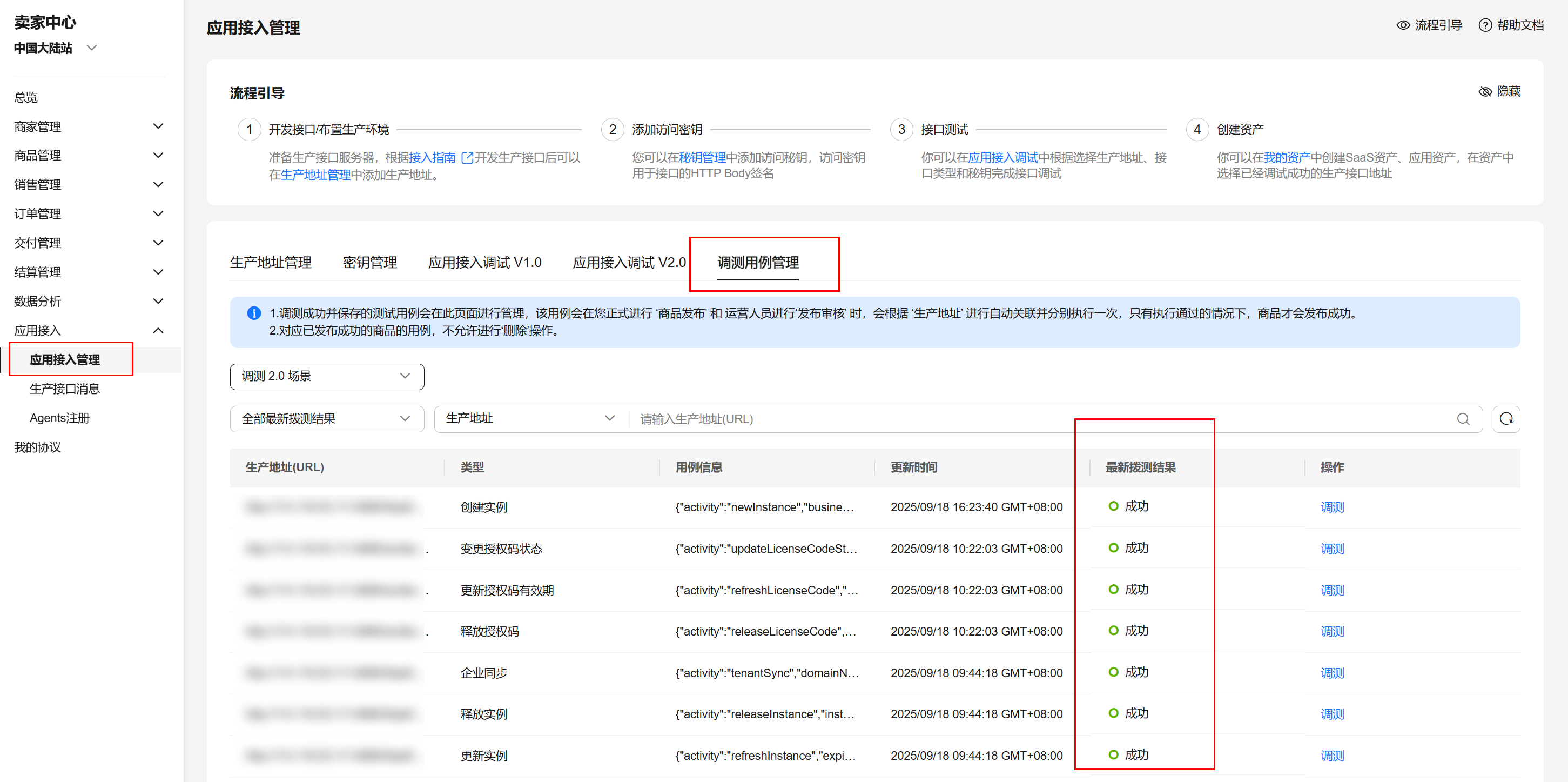 - 调测用例成功后,在“应用接入 > 应用接入管理 > 调试用例管理”,可在调试用例管理页面查询已调测成功的用例。
