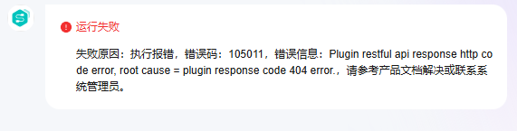 执行报错,错误码:105011,错误信息:plugin restful api response http code error, root cause = plugin response code 404 error.,请参考产品文档解决或联系系统管理员。