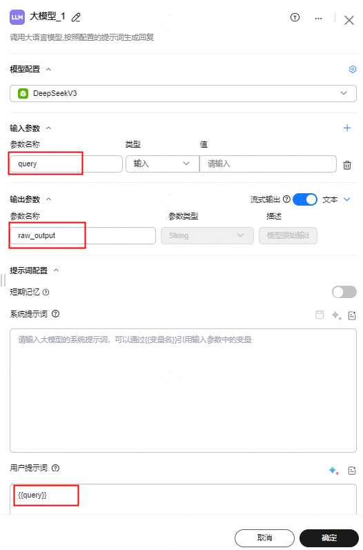 - 检查大模型提示词是否正确配置,检查用户提示词和系统提示词,是否使用了期望发给大模型的内容。