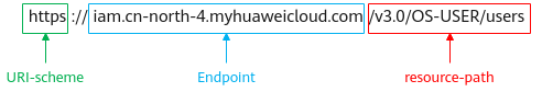 例如您需要创建iam用户,由于iam为全局服务,则使用任一区域的endpoint,比如“华北-北京四”区域的endpoint(iam.cn-north-4.myhuaweicloud.com),并在管理员创建iam用户的uri部分找到resource-path(/v3.0/os-user/users),拼接起来如下所示。