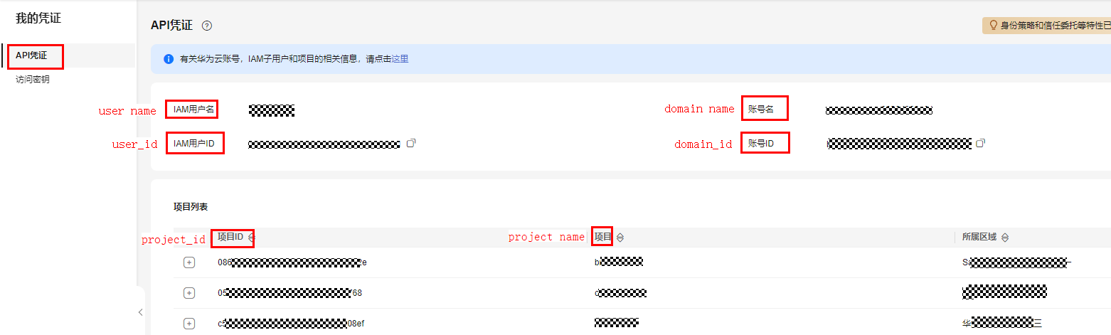 在调用接口时,部分uri中需要填入用户名、用户id、账号名、账号id、项目名称、项目id,在“我的凭证”页面可以获取这些信息。