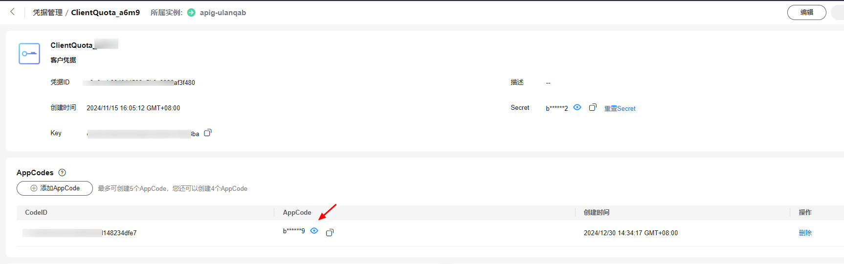 - 单击api使用的凭据名称进入凭据管理详情页面,查看appcode的值。