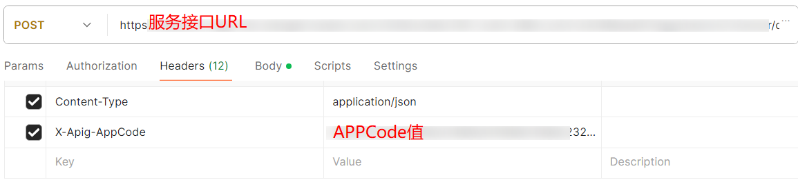 - 在使用postman中调用发送请求时,增加请求头部参数“x-apig-appcode”,省略请求签名相关信息,参数值填已生成的appcode。如下图所示。