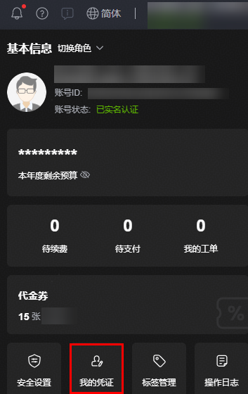 - 鼠标悬浮至右上角的用户名处,在下拉列表中单击“我的凭证”。