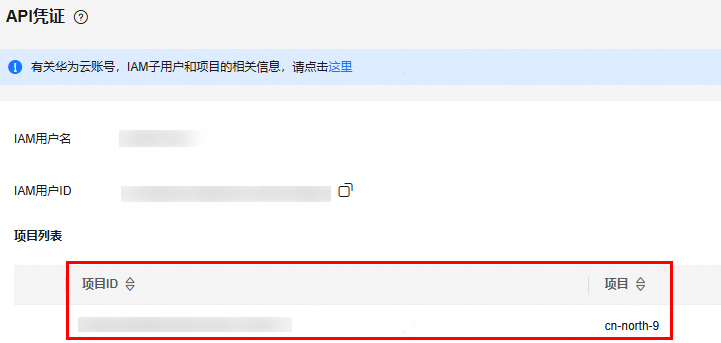 - 在“api凭证”页面的项目列表,“项目id”列的值为项目id,“项目”列的值为项目名称。