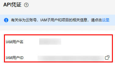 - 在“api凭证”页面,获取“iam用户名”和“iam用户id”。