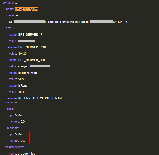 - 修改yaml中各container的requests大小,ers-agent-register如图2所示,修改各container的requests大小,修改的最小规格如表1所示,修改完成后,单击“保存”,完成插件规格修改。