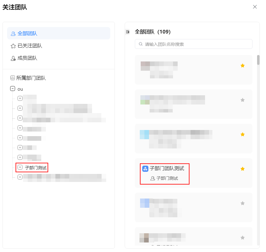 项目经理在“团队成员”页面将用户添加为团队成员后,该用户还需要在开发中心j9九游会登录首页“我的团队”中关注该团队,以关注“子部门团队测试”为例,如图1所示,关注团队后,该用户才可进一步在此团队以具备的角色权限进行相应操作。
