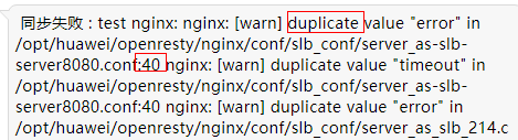 同步失败中出现duplicate时表示出现重复配置,登录slb实例主机,执行命令vim /opt/huawei/openresty/nginx/conf/slb_conf/xxx.conf查看配置文件预览里的对应行号(下图为40行)找到重复项。