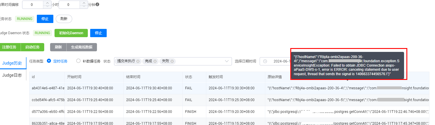 judge历史的原始详情中出现canceling statement due to user request错误提示,如下图:
