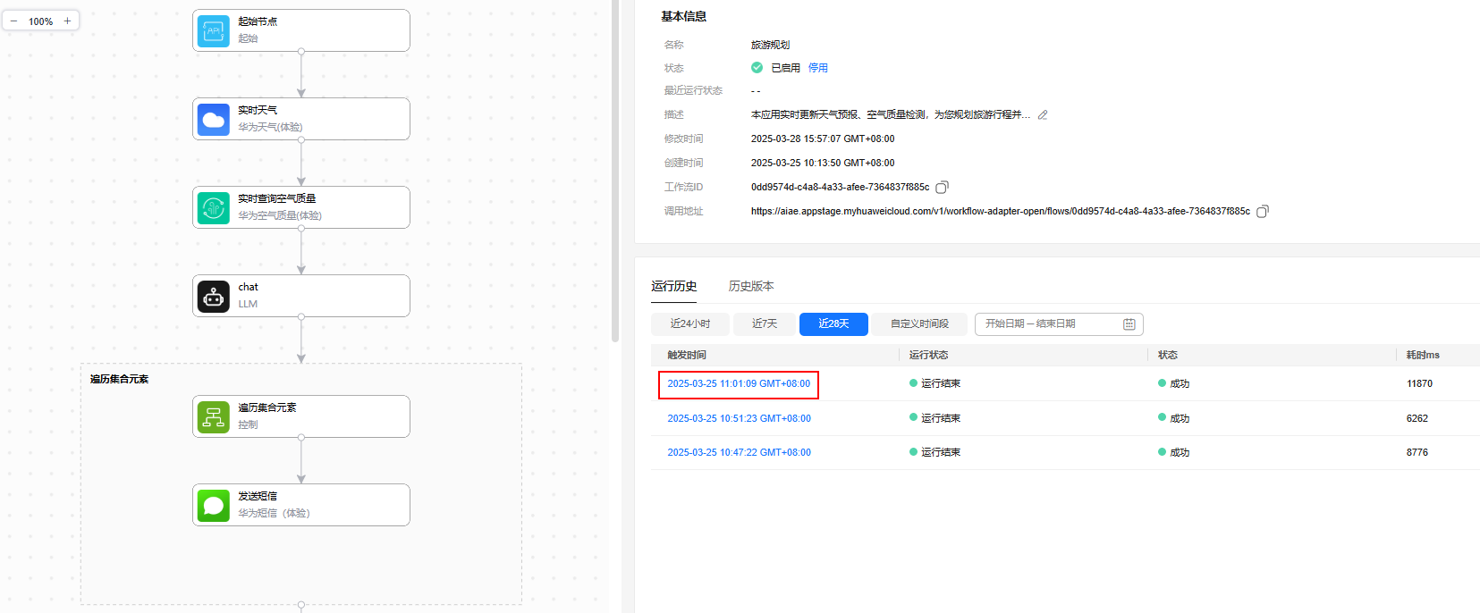 - 在“我的工作流”列表中单击工作流名称,在“运行历史”页签中可以查看工作流近24小时、近7天、近28天的运行历史记录,也可以自定义时间段进行查询。