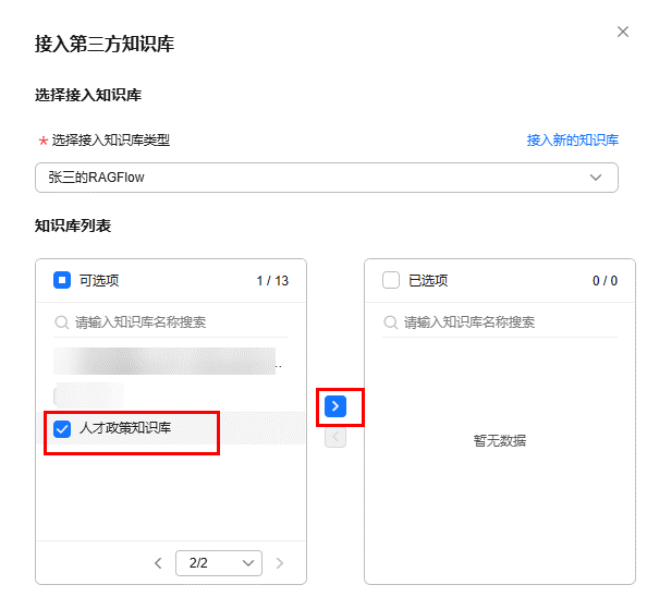 - 在“接入第三方知识库”界面中,单击“选择接入知识库类型”下拉框,从中选择需要接入的第三方知识库“张三的ragflow”。