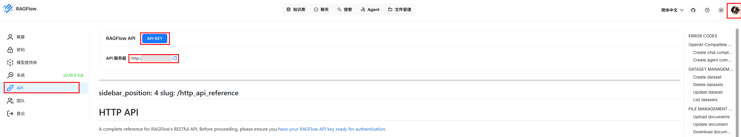 - 在ragflow“个人中心 > api”中获取ragflow的连接信息,包括api key和api服务器地址。
