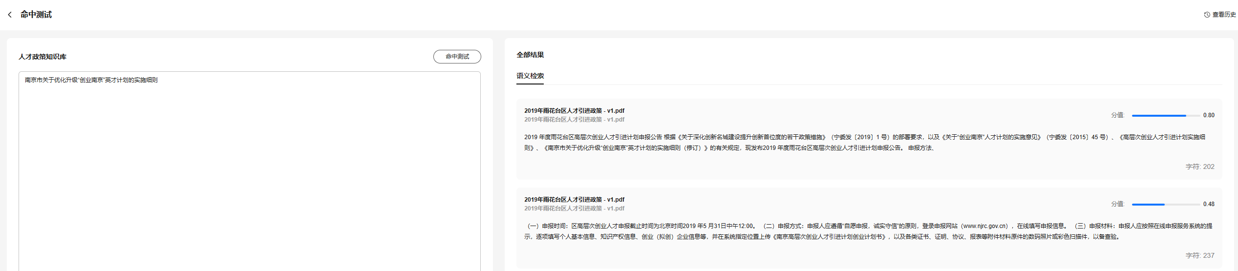 在命中测试页面右侧将根据语义检索方式,展示多条匹配的内容,并按照匹配分值降序排列。