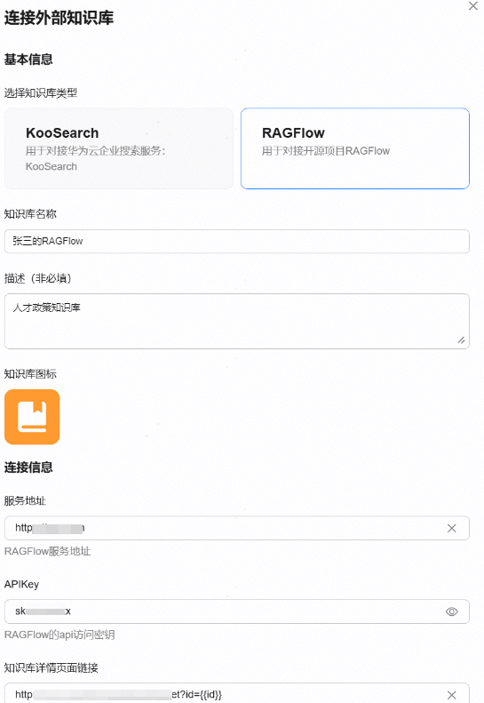 - 在弹出的对话框中,单击“ragflow”,参见表1设置外部知识库基本信息。