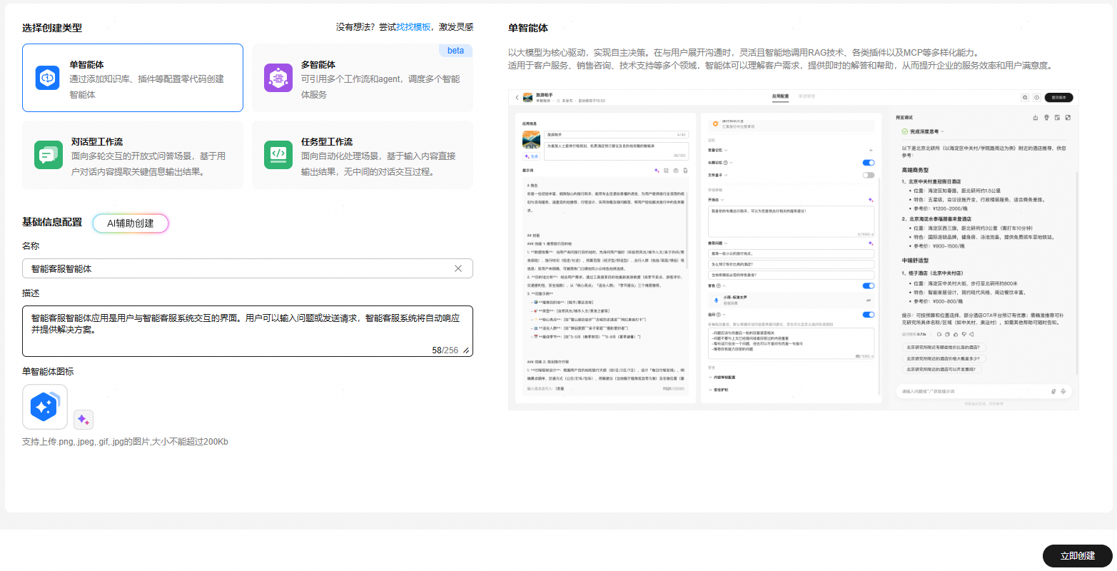 - 可在基础信息配置页签中设置应用的基础信息,输入应用名称、描述等信息,并选择“单智能体应用图标”。