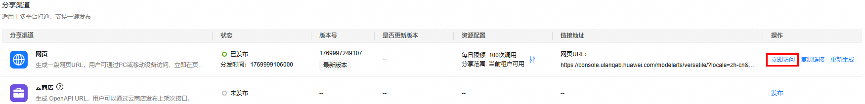 在渠道管理页面,网页分享渠道的操作列单击“发布”按钮后将出现“立即访问”、“复制链接”、“重新生成”文字按钮。这里可以通过两种方式访问agent应用的网页应用链接,同时支持重新生成发布链接。
