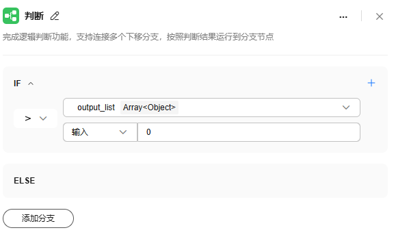第一个分支,参数是“知识检索”节点输出的“output_list”,比较条件是“长度大于”,比较对象是“输入”,值为“0”。图9 配置“判断”节点