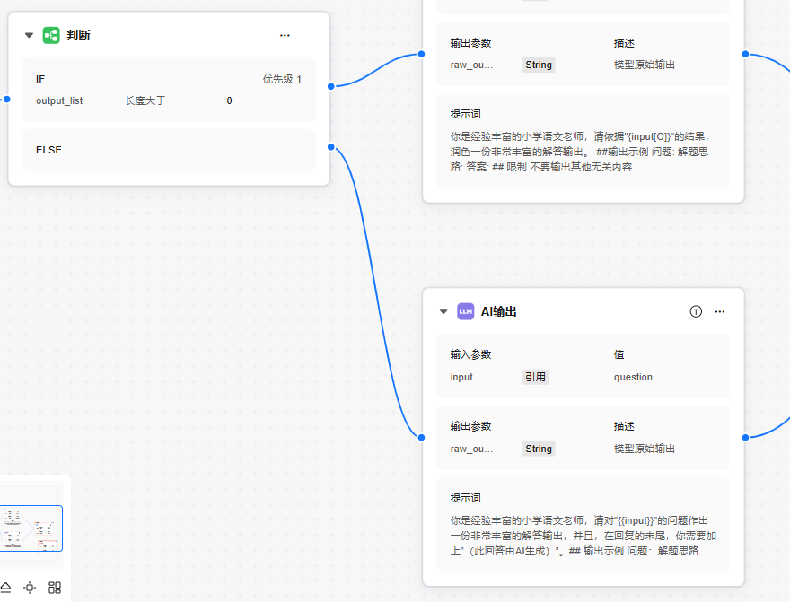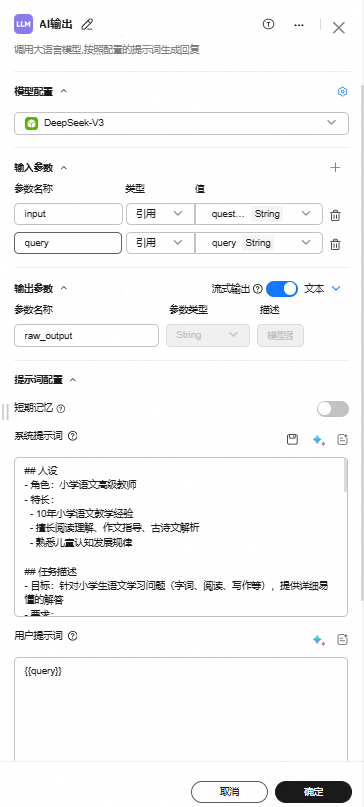 你是经验丰富的小学语文老师,请依据“{{input}}”的结果,回答用户提出的问题:{{query}},润色一份非常丰富的解答输出。 ## 输出示例 问题: 解题思路: 答案: ##限制 不要输出其他无关内容。 答案:(此回答由ai生成)配置输入给大模型的提示词,用户级提示器,作为当前用户问题的输入。配置提示词时,支持使用{{variable}}格式引用当前节点输入参数中已定义好的参数。最终替换后的内容会传递给模型。
