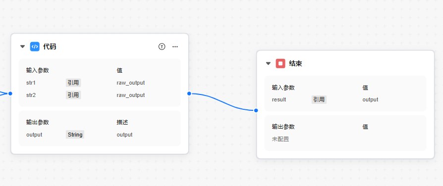 - 单击“添加节点”,选择“代码”,添加“代码”节点至编排页面,连接“润色输出”大模型节点和“ai输出”大模型节点到代码节点。