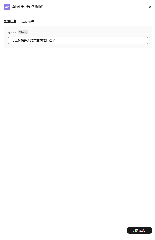配置大模型处理需要的输入参数值, 这些值会动态添加到提示词中,默认设置的输入参数名为“query”。