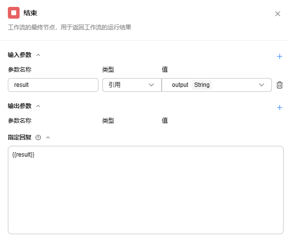 - 单击“结束”节点,如图 配置“结束”节点配置输入参数和回复。