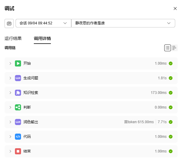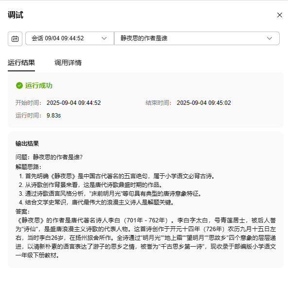 ”。 - 在对话框中直接与工作流进行交互,实时观察其执行过程和响应效果,并根据需要对配置进行优化和调整。