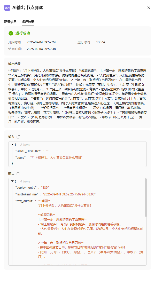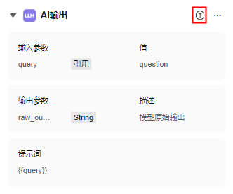 必要时也可以针对工作流中的某个节点单独进行调试,以保证节点的成功运行。以调试“ai输出”节点为例。- 在工作流编排页面,单击“ai输出”节点的“