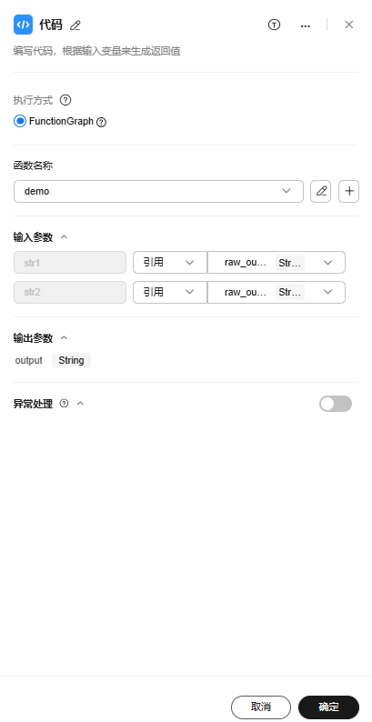 str1= inputdata.get('str1','') str2= inputdata.get('str2','') answer= str1 str2 result = { "output": answer, }选择下拉列表中的函数,即之前已定义保存的函数,也可以进行以下操作。