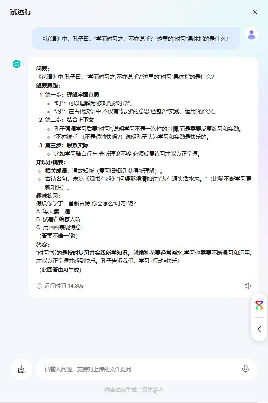 试运行界面支持文本输入、文件输入和语音输入:- 文本输入:在对话输入框输入对话后按enter键或单击