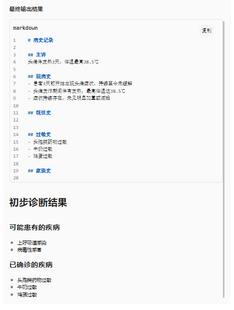 当前医生面临门诊量大、问诊时间有限、病历书写负担重等挑战,为提升诊疗效率与病历质量,降低医疗误差,我们搭建一款能够实时理解医患对话、自动生成“一诉五史”(主诉、现病史、既往史、个人史、家族史、过敏史)、关键查体要点及初步诊断的智能辅助系统,从而优化诊疗流程,提升医疗服务质量。