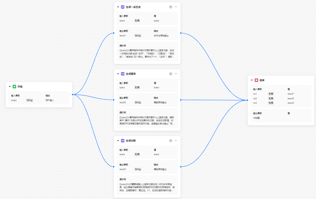 - 大模型节点-生成查体:该节点利用大模型对用户的查体信息进行分析,生成详细且完整的查体建议。