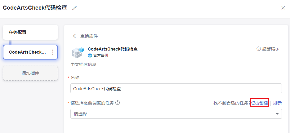 - 在“新建任务”页面的右侧区域,选择“代码检查”页签,单击“codeartscheck代码检查”后的“添加”,将此插件添加到任务中,如图4所示。