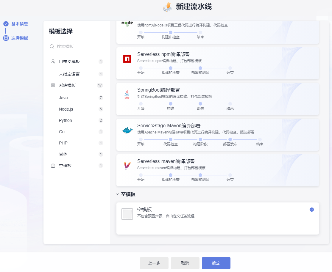 进入“新建流水线 > 模板选择”页面,请根据需要选择对应模板,在模板基础上快速新建任务;也可以选择“空模板”,即不使用模板,直接新建。如图2所示。