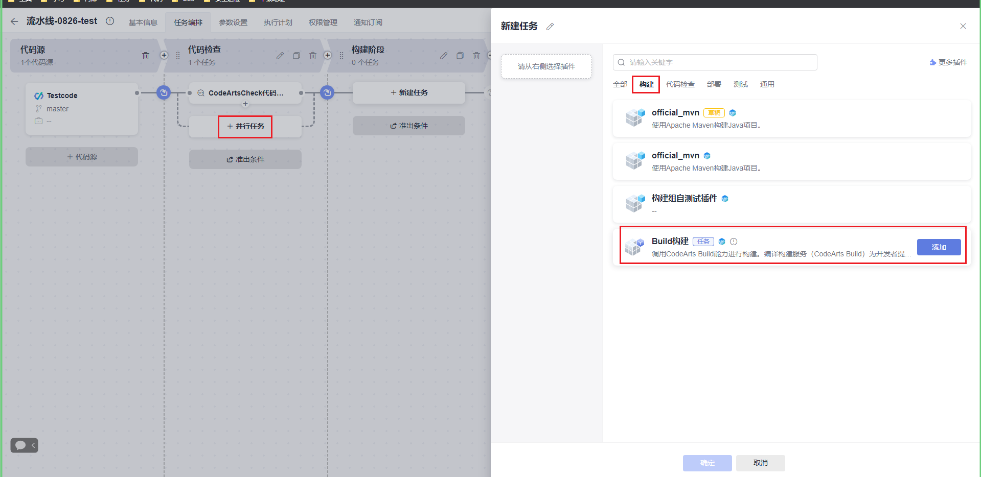 - 在“新建任务”页面的右侧区域,选择“构建”页签,单击“build构建”后的“添加”,将此插件添加到任务中。